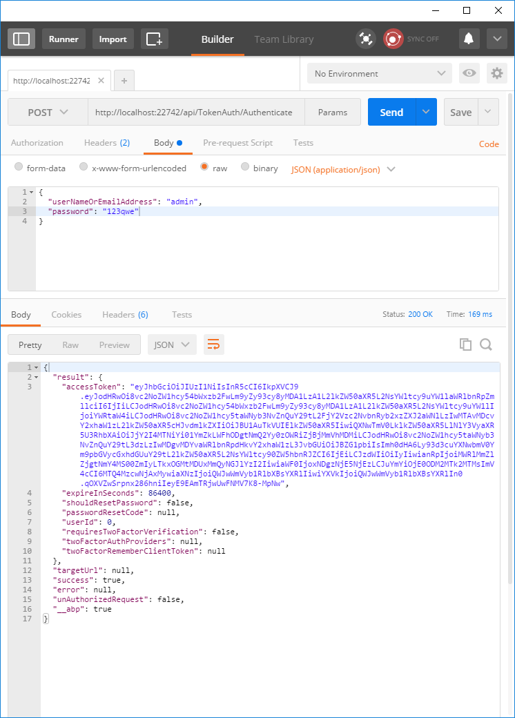 Then we can send username and password as a POST request to https://localhost:44301/api/TokenAuth/Authenticate