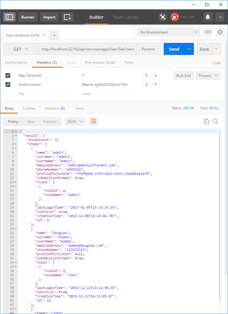 We sent a GET request to https://localhost:44301/api/services/app/User/GetUsers and added Authorization to the header as " Bearer <accessToken> ". And the result is a JSON that contains the list of users.