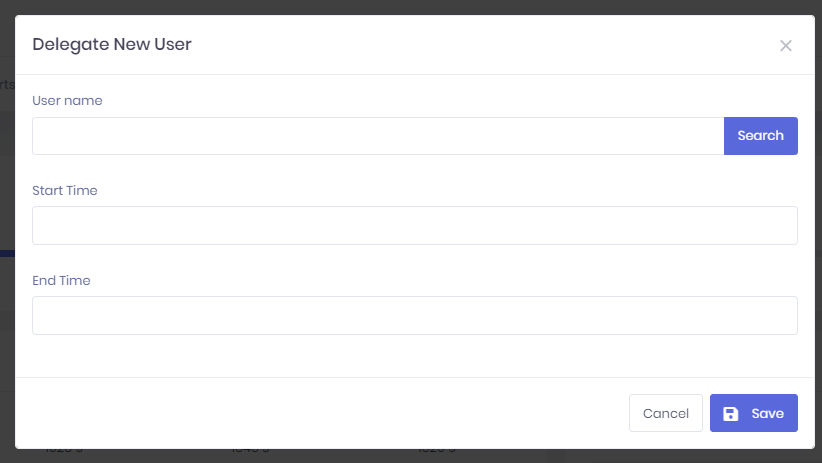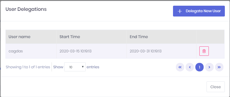 User Delegations modal lists currently delegated users. You can delete a user delegation on this modal.