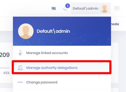 User Delegations modal window can be accessed by clicking "Manage authority delegations" on user profile menu.