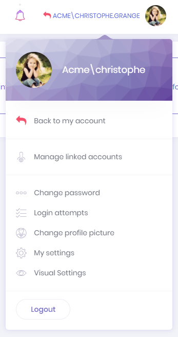 As an admin user (or any allowed user), we may want to login as a user and perform operations on behalf of that user, without knowing the user's password. When we click " Login as this user " icon in the actions of a user, we are automatically redirected and logged in as this user. This is called " user impersonation ". When we impersonate a user, a " back to my account " option is added to the user profile menu: