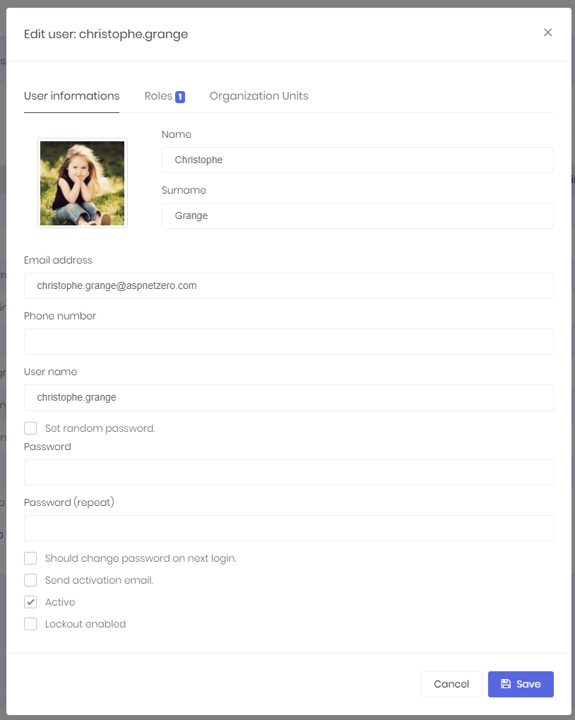 We can change user's password, make the user active/passive and so on... A user can have a profile picture. It can be changed by the user (See User Menu section). Admin user can not be deleted as a business rule. If you don't want to use admin, just make it inactive.