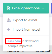 User list can be downloaded as an Excel file. Also, new users can be imported from an Excel file. In order to import users from an Excel file, IntelliSent requires a specific excel file format. You can download a sample import template on the user list by clicking the "click here" link under the "Excel operations" dropdown button.