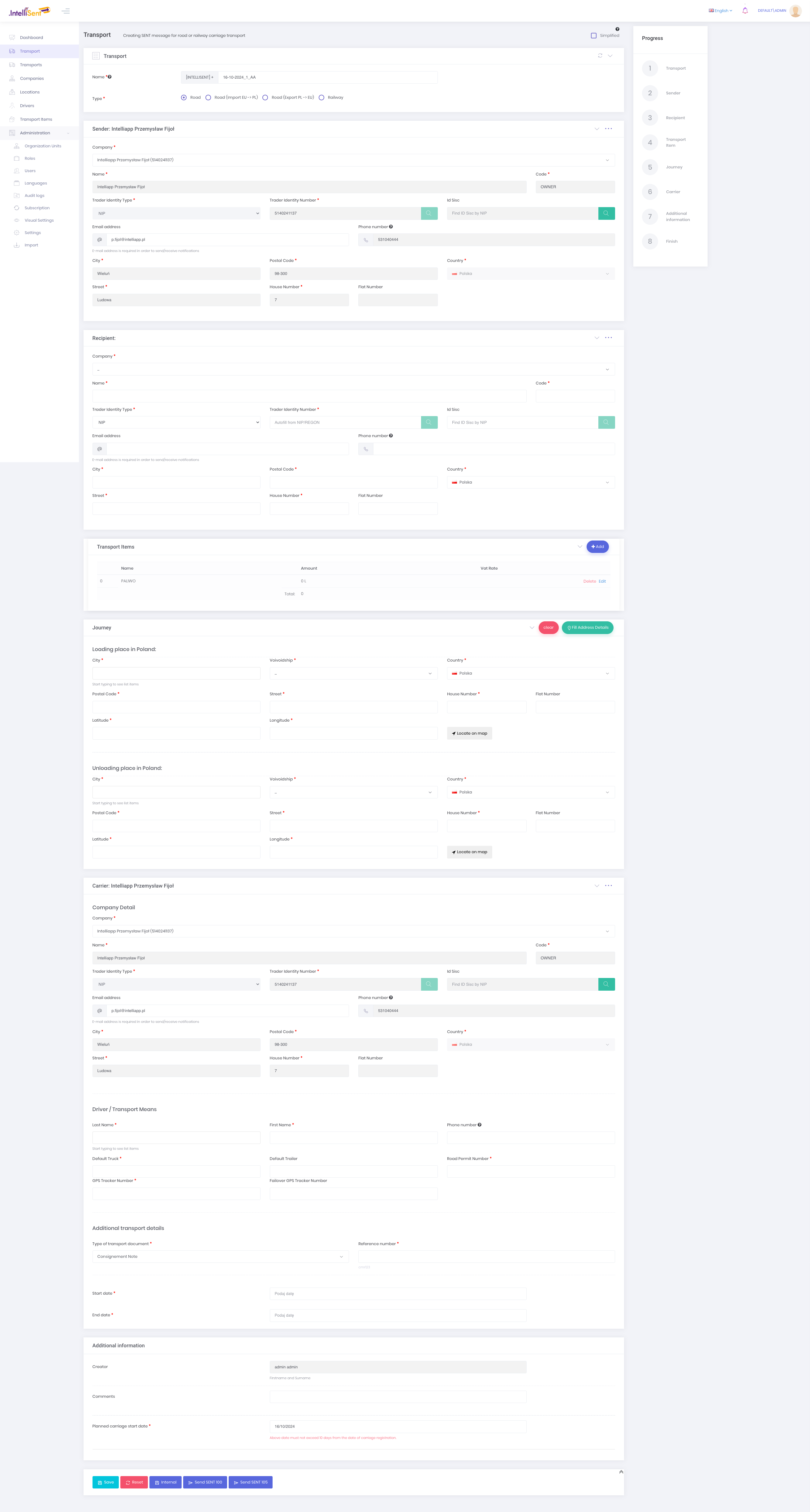 The Transport page allows you to create and manage shipment details for your logistics operations. This guide will walk you through the main sections and features of the page.